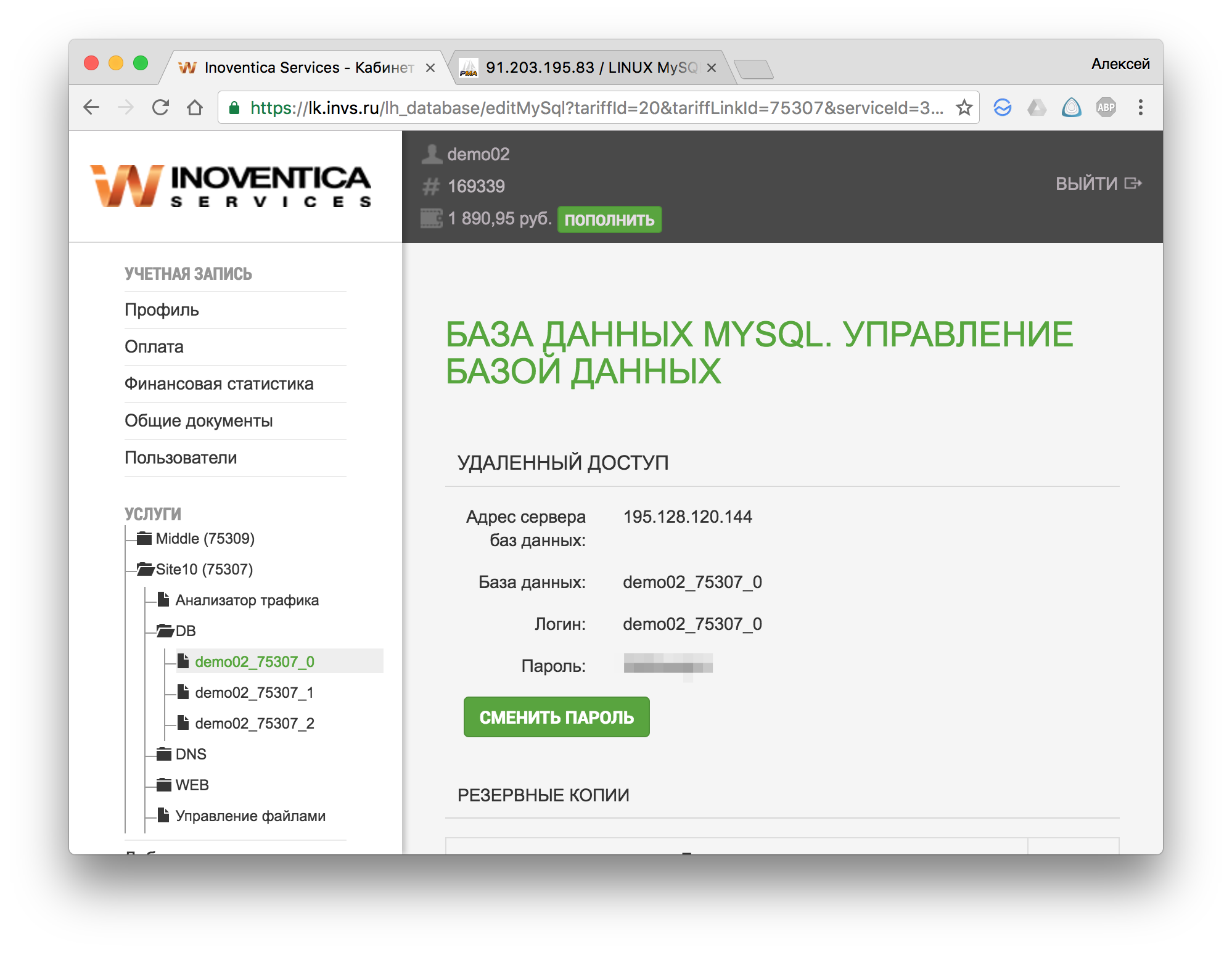 1.) Получить данных для входа в phpMyAdmin. Вам необходимо выбрать вашу услугу хостинга в личном кабинете, зайти на вкладку “DB”, а потом выбрать интересующую вас базу данных.