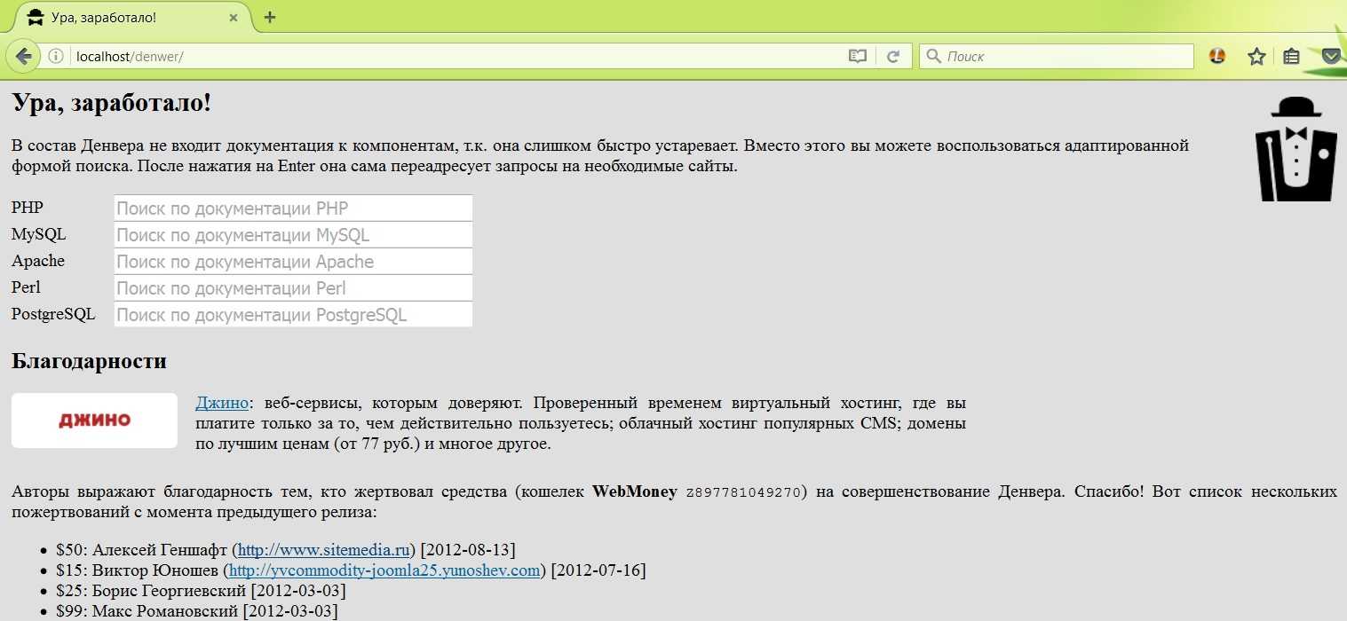 - Так как Денвер – бесплатный софт, то для поддержания проекта, создатели принимают от благодарных пользователей пожертвования. Ну, и я заметил партнерскую ссылку на хостинг «Джино».