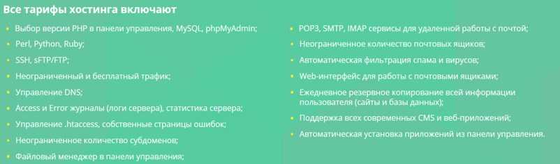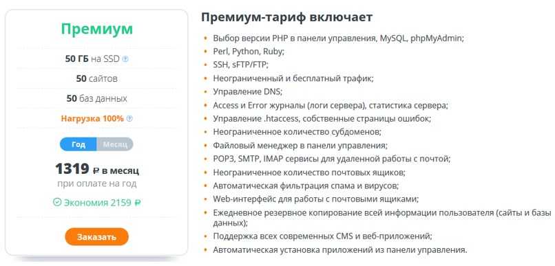 Минимальный тариф – 219 р./мес., при этом доступно 10ГБ дискового пространства и 5 сайтов. Что включают тарифы?
