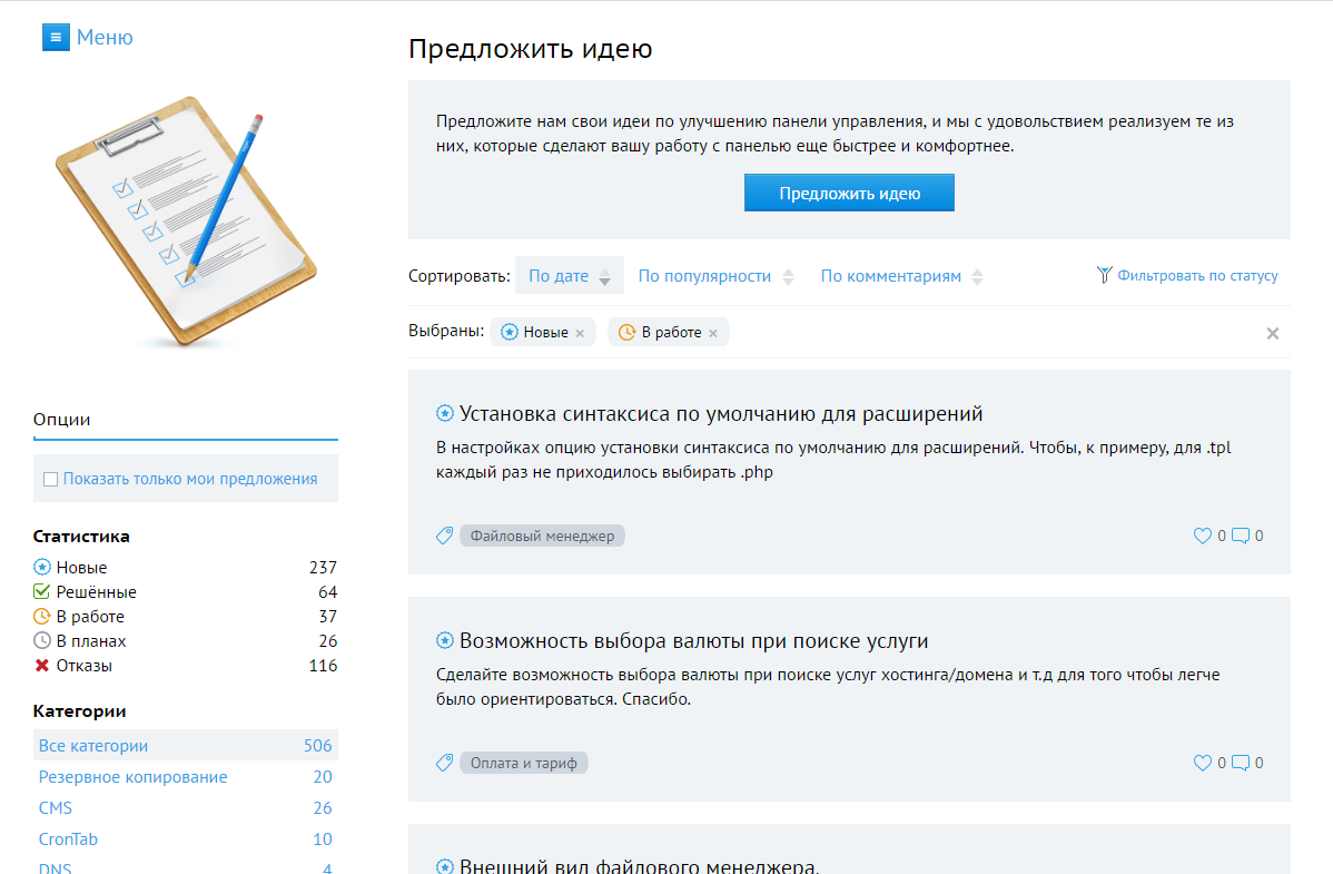 Любой клиент хостинга может зайти и написать туда свои пожелания, оставить комментарии и лайки к уже существующим. Т.е. есть реальная обратная связь с клиентами, они прислушиваются к нашим отзывам, и многое уже реализовано, или в работе.