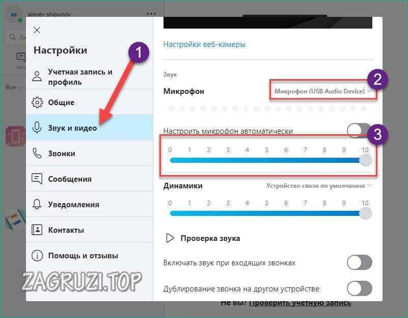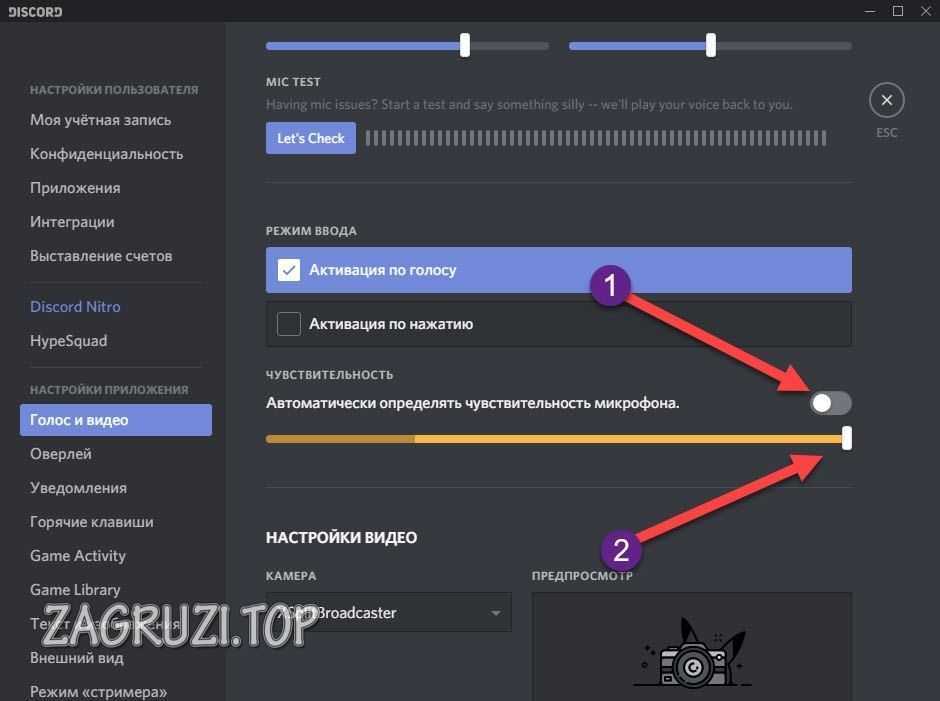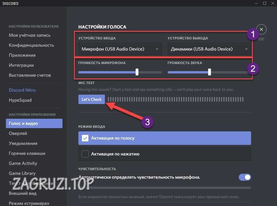 - Перейдите на вкладку «Голос и видео». Здесь Вы можете выбрать устройства ввода/вывода (1). Регуляторы громкости расположены ниже (2). Чтобы услышать свой голос, нужно нажать на кнопку «Давайте проверим» (3). Вы услышите небольшую задержку — это нормально. После прослушивания вашего голоса, отрегулируйте громкость.