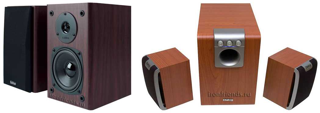 Питание происходит от сети либо от USB. Подключается с использованием линейного входа 3,5 мм или разъема RCA. - 2.1 – характеризуется более широким спектром частот. Комплектация включает в себя две колонки и один сабвуфер. 2.1 так же, как и предыдущий вариант воспроизводит звук в формате стерео: две колонки играют средние и высокие колебания, а сабвуфер воспроизводит низкие — до 100 Гц.