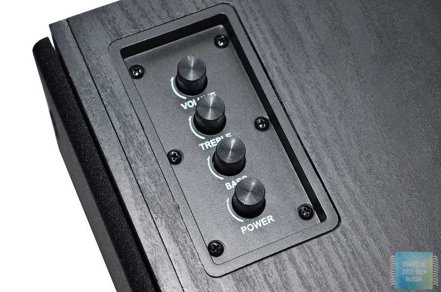 Помимо стандартной регулировки звука и кнопки включения, предусмотрена регулировка уровня НЧ и тембра. Блок регулировок утоплен в правой сателлите сбоку.