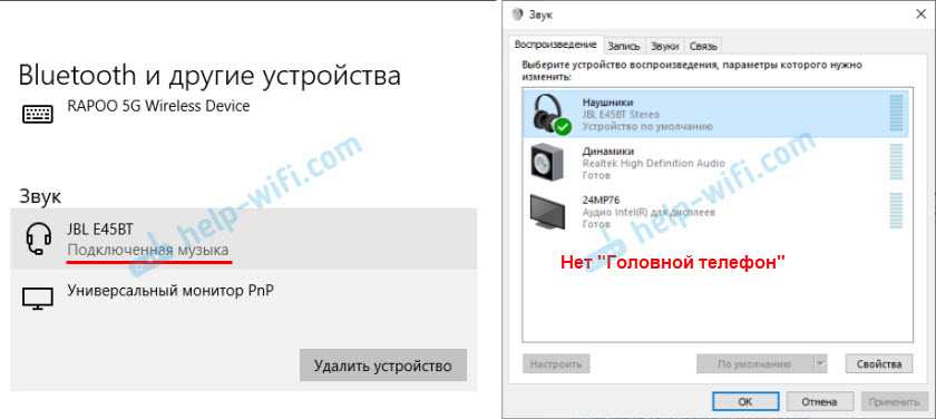 Если то решение, которое я показывал выше не помогло, то можно попробовать в свойствах наших Bluetooth наушников отключить службу «Беспроводная телефонная связь». После чего компьютер будет видеть эти наушники просто как наушники, а не гарнитуру. В настройках звука исчезнет «Головной телефон». А в параметрах Windows 10 возле устройства будет написано просто «Подключенная музыка» (без «голос»).