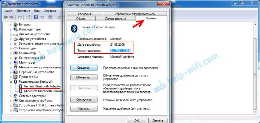 Откройте диспетчер устройств и на вкладке «Радиомодули Bluetooth» откройте свойства Bluetooth модуля. У меня он назывался до обновления драйвера Generic Bluetooth Adapter. Открываем его свойства и на вкладке «Драйвер» смотрим дату разработки и версию.