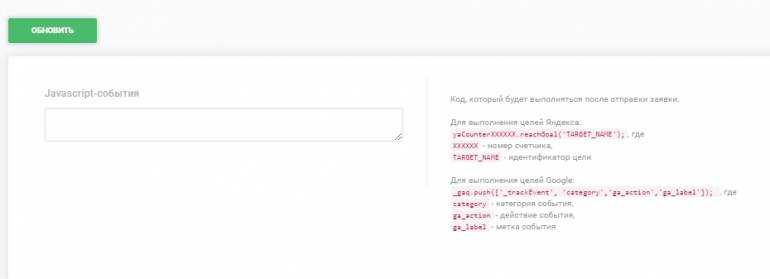 В случае необходимости отслеживать статистику по обращениям можно настроить отправку целей в систему аналитики Яндекса или Google во вкладке JavaScript-события. Шаблоны кода для отправки указаны на этой же странице, останется только подставить в код номер счётчика и имя событий. Эту же вкладку можно использовать для выполнения любого другого Java-script кода, например JS-редирект на другую страницу вашего сайта.