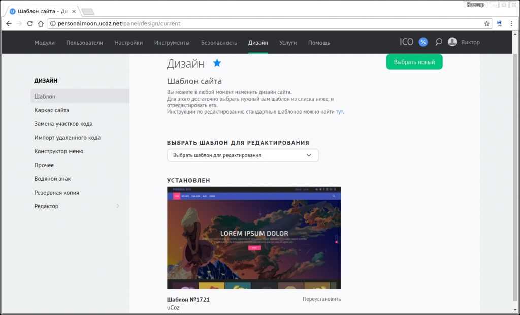 Чтобы выбрать другой шаблон дизайна и применить его к сайту, перейдите на вкладку «Дизайн». Далее перейдите в раздел «Шаблоны», выберите нужный шаблон и нажмите OK.