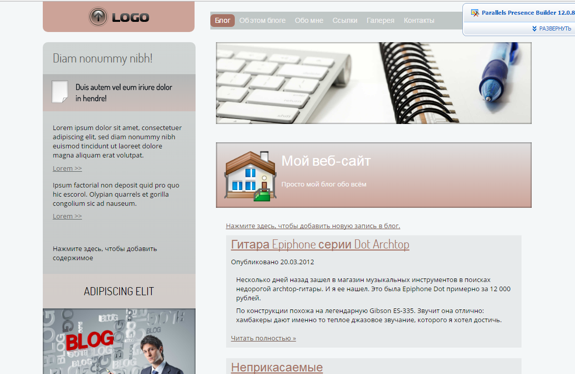 Дополняю: нашла хостинг, где встроен Parallels Web Presence Builder — это, как минимум, Hostlife.net, Hostland.Ru, Mosdomen.ru, Ruskyhost.ru. С последним я начинала создание сайта, но общего языка не нашла — техподдержка не понравилась, поэтому перешла на Reg.ru. Там мне помогли и сайт перенести на их хостинг и все настроить, потому что на тот момент я была совсем дуб дубом! И на протяжении уже нескольких лет техподдержка всегда очень помогает, и не ржут над моими (может быть, по их мнению) тупыми вопросами «чайника». А все нормально и терпеливо объясняют.