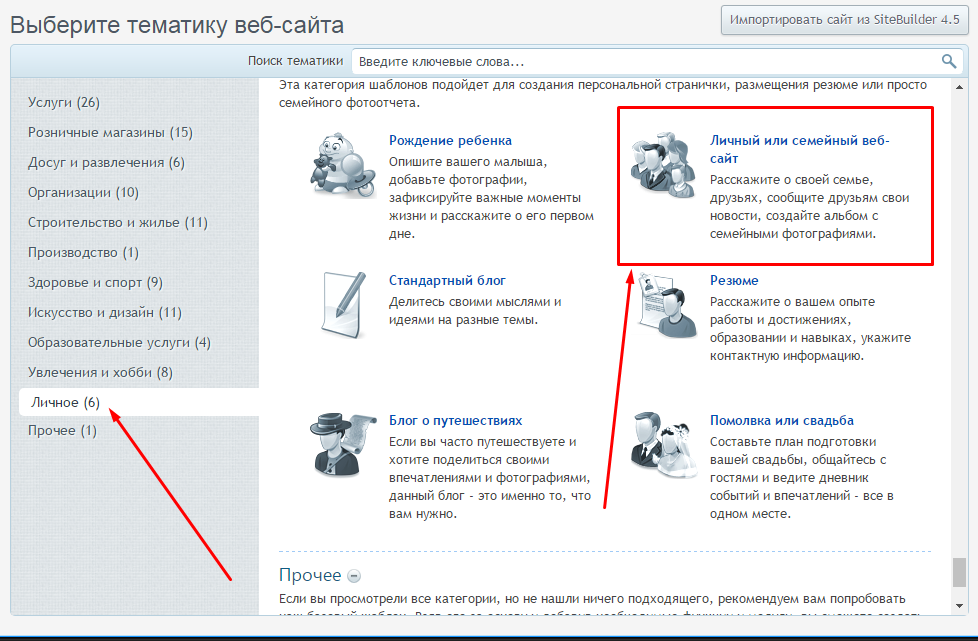 В разделе «Личное» вы можете создать личный или семейный веб-сайт, блог о путешествиях, семейный фотоотчет о каком-то важном событии в жизни — помолвке и свадьбе, рождении ребенка и т.д