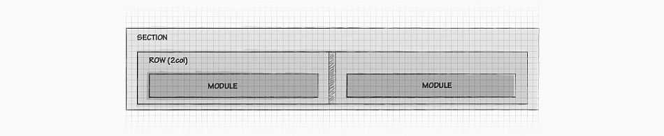Конструктор использует три основных строительных блока: Секции (или разделы), строки (или ряды) и модули. Использование этих структурных блоков позволяет создать бесчисленное количество макетов страниц. Основная иерархия этих элементов выглядит следующим образом: