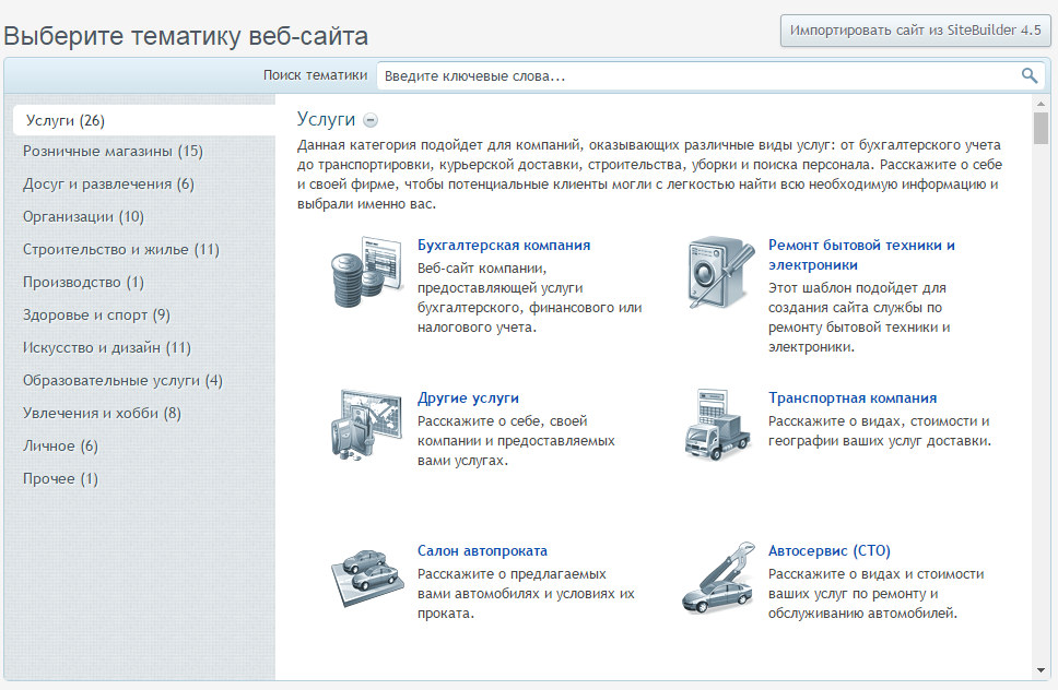 Если вам необходимо создать сайт магазина, то переходите в раздел «Розничные магазины» и выбираете, то направление, какое вам необходимо, например, магазин одежды, автозапчастей, цветов, мебели, игрушек и т.п. — выбор достаточно широк. Если вы хотите создать тематический блог (поклонников рок-группы, спортивной команды, кино, видеоигр), то вам в раздел «Увлечения и хобби». Если вы оказываете какие-либо услуги и хотите рекламировать их в интернете, то выбирайте соответствующие вашему профилю разделы: «Образовательные услуги», «Здоровье и спорт», «Строительство и жилье», «Досуг и развлечения» и т.д. Если вы создаете сайт организации или предприятия, ассоциации или фонда, политической партии или благотворительной организации, сайт города, поселка или деревни, то выбирайте раздел «Организации»