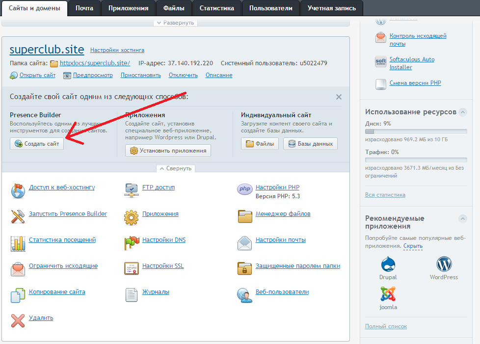 Кликните по названию услуги «Parallels WPB-Lite/Standart/Pro для домена mysite.ru», где mysite.ru — название вашего сайта: