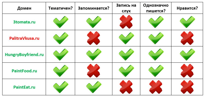 Можете даже составить себе табличку и сравнить их по параметрам. Вот пример, как это было у меня. Красным выделен домен, который был занят, просто я его не исключал из таблицы.