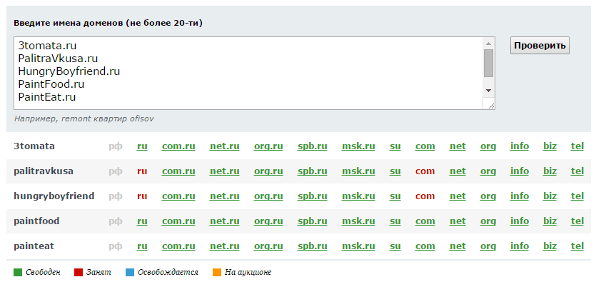 Домен можно проверить тут https://www.nic.ru/ – вбиваете туда придуманные домены и нажимаете Проверить. Очень удобно, что можно проверять до 20-ти доменов сразу!