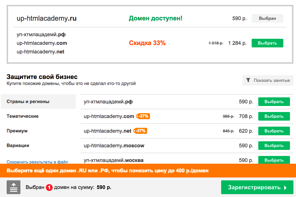 Регистратор сразу предоставляет вам возможность получить скидку при покупке нескольких доменов. Вы выбираете только то, что вам нужно и нажимаете на кнопку «Зарегистрировать» в нижней части экрана.