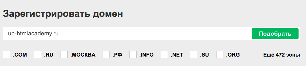 На главной странице сайта введите желаемое доменное имя в поле ввода и нажмите Подобрать: