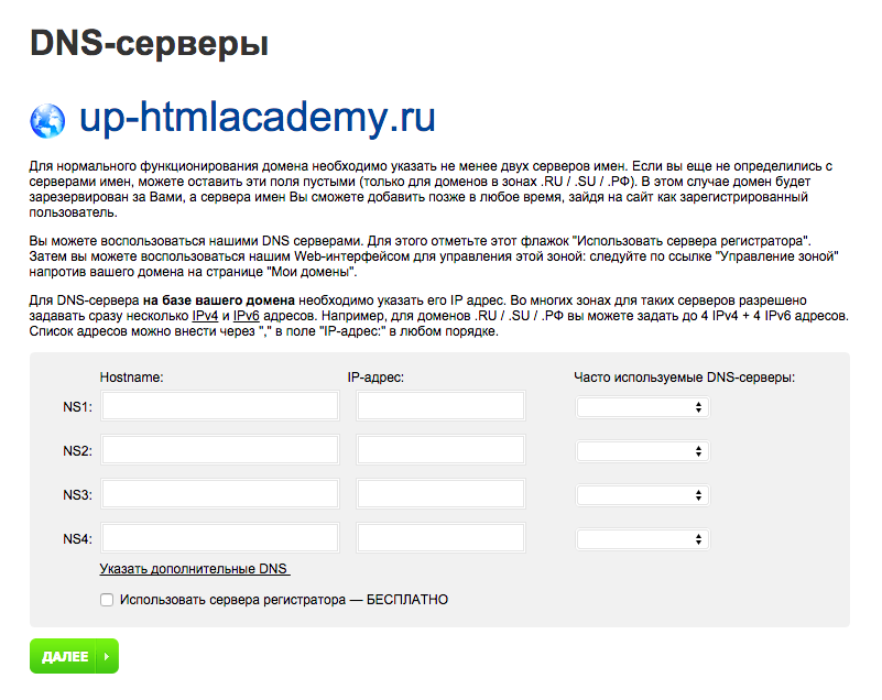 Если вы уже определились с тем, кто будет управлять DNS-зоной вашего домена (например, если у вас уже есть хостинг), то можете заполнить их здесь. В противном случае, эти поля можно оставить пустыми.