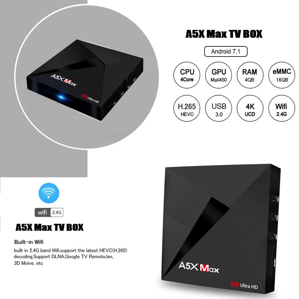 Процессор: Amlogic S905X3 (4 ядра) ARM Cortex A55Оперативная память: 2 — 4 ГБ DDR3Графический процессор: Mali-G31 MPВстроенная память: 16 — 64 ГБ eMMCИнтерфейс: WiFi: 802.11a/b/g/n/ac 2.4GHz/5GHz, Bluetooth 4.2, SPDIF, LAN 100 Мбит, Видеовыход: HDMI 2.1 (4K@75 fps, 4Kx2K@60 fps, 8K@24 fps), HDR10, VP9+, 3.5mm AV выход, MicroSD до 32 Гб, 1xUSB 3.0, 1xUSB 2.0 OTG, DLNA, поддержка CEC, IPTV, PLEX Media Server, ROOT — права, RGB LightОперационная система: Android 9.0