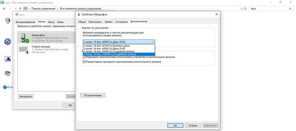 Возможно, микрофон отказывается записывать звук, так как уже используется какой-либо программой. По умолчанию монополия разрешена, а отключить её можно в свойствах микрофона, описанных в пункте «Стандартными средствами Windows».