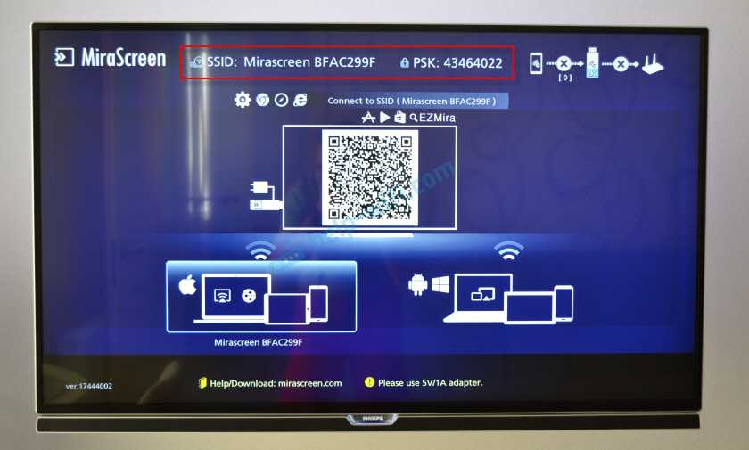 Второй вариант: через приложение. Есть разные приложения, через которые можно получить доступ к настройкам MiraScreen через телефон или планшет. Как правило, после подключения адаптера к телевизору на экране отображается QR-код. Это как раз ссылка на загрузку приложения. Для моего адаптера приложение называется EZMira.