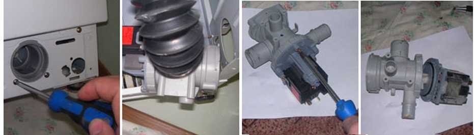 открутите сливной насос от основания автомата. Болты, удерживающие помпу, расположены с внешней стороны, около клапана слива;