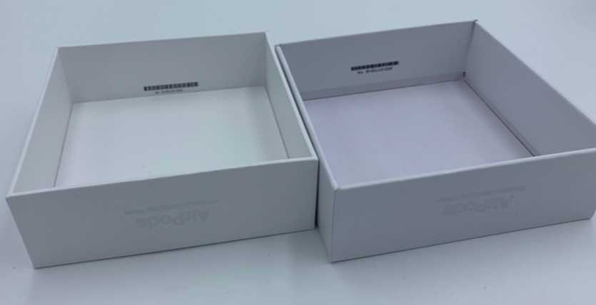 На поддельной коробке с целью уменьшить издержки наносят обычный плоский рисунок. Логотип на коробке с оригинальными наушниками переливается в лучах света, а на коробке от фальсификаторов цвет логотипа остается неизменен, как его ни поворачивают.