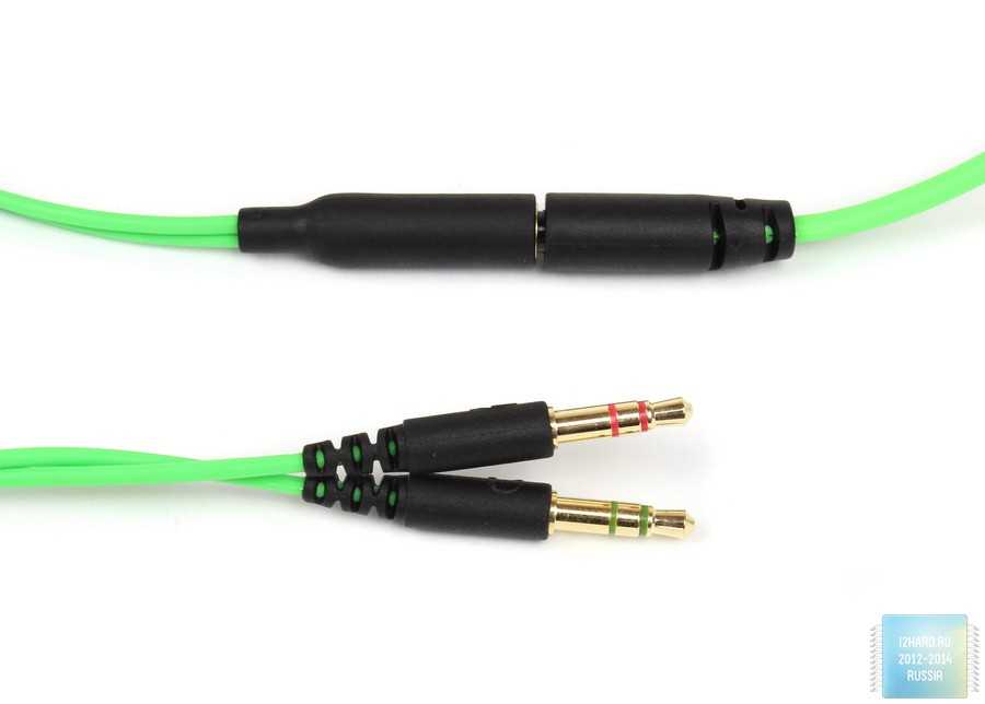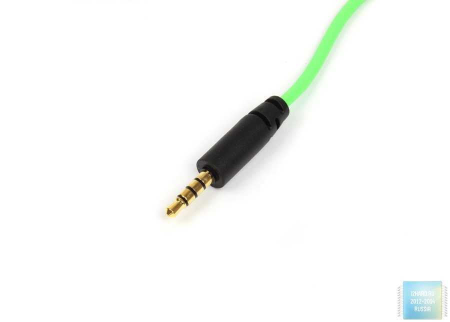 Сама штанга с микрофоном крепится к левому наушнику, крепление надёжное, должно прослужить долго. К этому же наушнику крепится и кабель. Он ядовито-зелёного цвета, Razer же. Имеет одиночный коннектор и длину 1,3 метра. Очевидно, что наушники в таком виде предполагают использование с мобильными устройствами, смартфоном, планшетом или ноутбуком с комбинированным аудиовыходом. Для обладателей полноценных компьютеров производитель положил в комплект удлинитель с двойным коннектором (наушники и микрофон), который увеличивает общую длину кабеля на 2 метра.