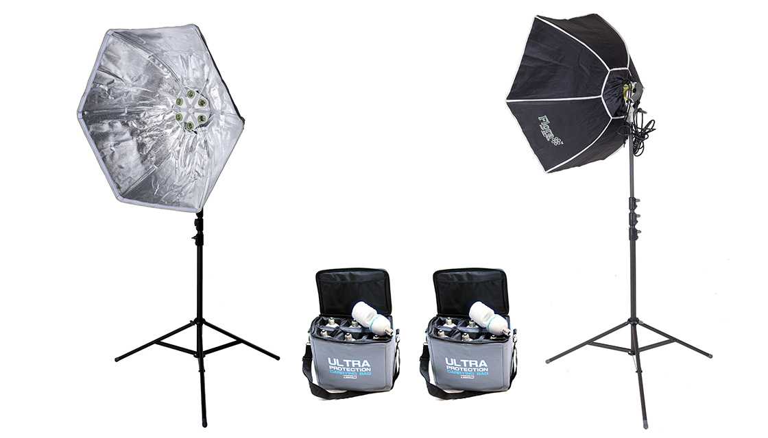 Конкретно этот набор из двух софтбоксов нравился нам за простоту установки и качество. Очень крепкие и надежные стойки. Света 12 ламп достаточно для освещения любой сцены (по 6 в каждом софтбоксе). Есть возможность включать только 3 лампы из 6. Софтбоксы складываются в удобную сумку для хранения. Для ламп мы нашли отдельные защищенные кейсы. Спофтбоксы имеют форму гексагона, довольно крупного, что добавляет красивое отражения в глазах.