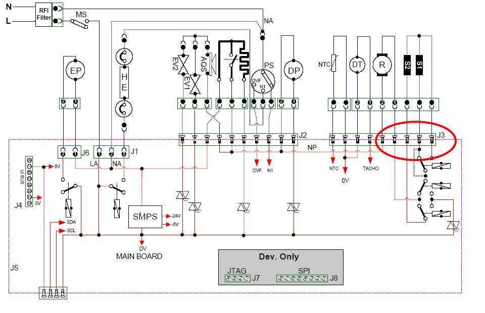 На данной схеме красным обведены контакты разъема J3 для подключения электродвигателя. К контактам под номером 2 и 3 подключают обмотку статора, середина обмотки подключается к контакту 1. К контактам 4 и 5 подсоединяется обмотка ротора. За управление приводным двигателем отвечает мощный симистор BTB16-600 (на 16 А) и реле. При возникновении ошибки в первую очередь проверяются именно эти элементы. В случае неисправности производится их замена.