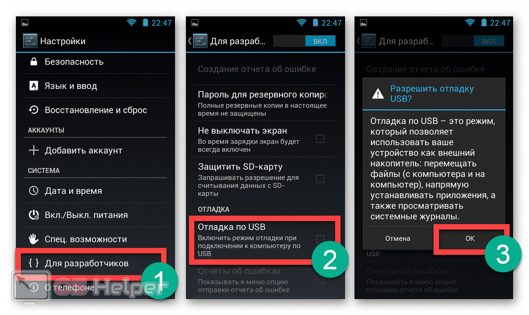 Если вы решили подключить телефон через USB-кабель (смартфон не подключен к роутеру, а компьютер не оснащён модулем Bluetooth), то предварительно нужно активировать режим «Отладка по USB»: