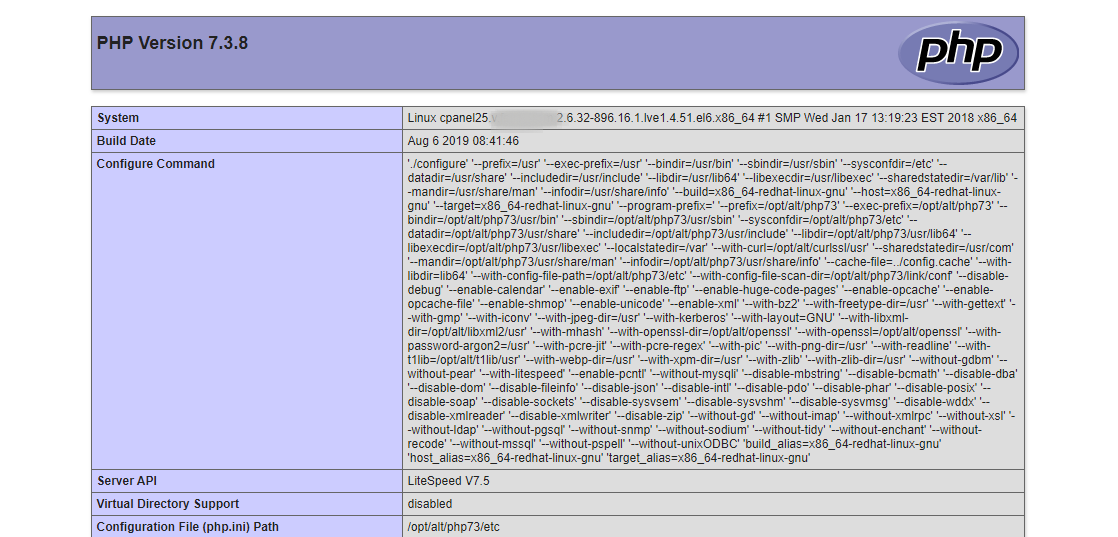 В окне браузера отобразится таблица с полной информацией о настройках сервера, на котором размещен ваш аккаунт.