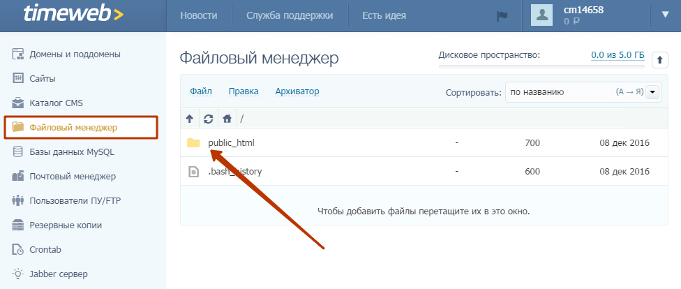 Перенесите файлы на другой сервер. Для того чтобы выполнить эту операцию, рекомендуется задействовать файловый менеджер или FTP-клиент. Нужно скопировать набор файлов, принадлежащих сайту, и вставить их в директорию «public_html». На портале TimeWeb эта папка располагается в разделе «Файловый менеджер».