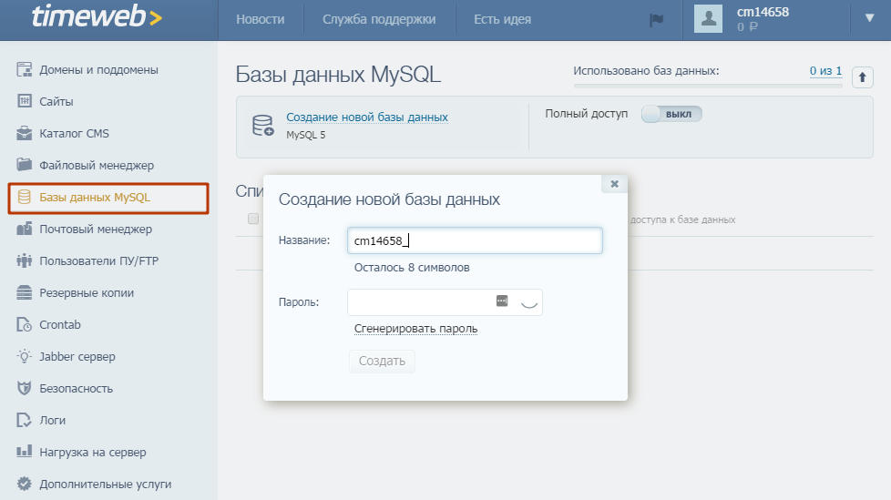 Если ваш портал использует систему управления контентом (CMS), без этого элемента вам не обойтись. Сначала вам нужно скопировать файлы на старом хостинге (желательно тоже в архиве). Затем следует разместить базу на портале нового провайдера. На TimeWeb это делается через раздел «Базы данных MySQL»