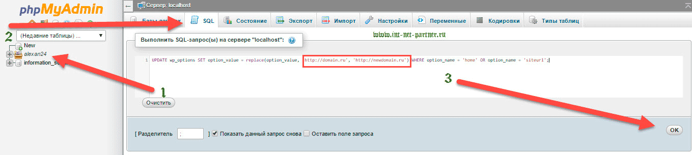 Теперь нам нужно в самой базе данных изменить все ссылки типа http://domain.ru заменить на http://newdomain.ru. Иначе все картинки и страницы интернет-ресурса будут ссылаться на новый домен. Далее я Вам приведу три способа как это сделать: