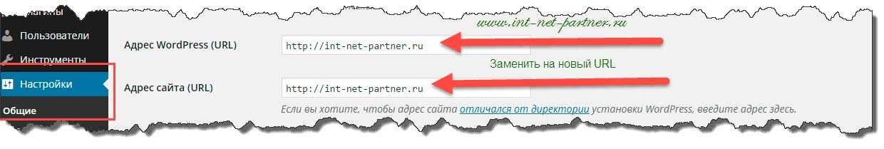 2). В полях «Адрес WordPress (URL)» и «Адрес сайта (URL)» вставьте адрес нового домена и нажмите кнопку «Сохранить изменения». После чего Вордпресс вас сразу же переадресует на страницу входа на новом домене.
