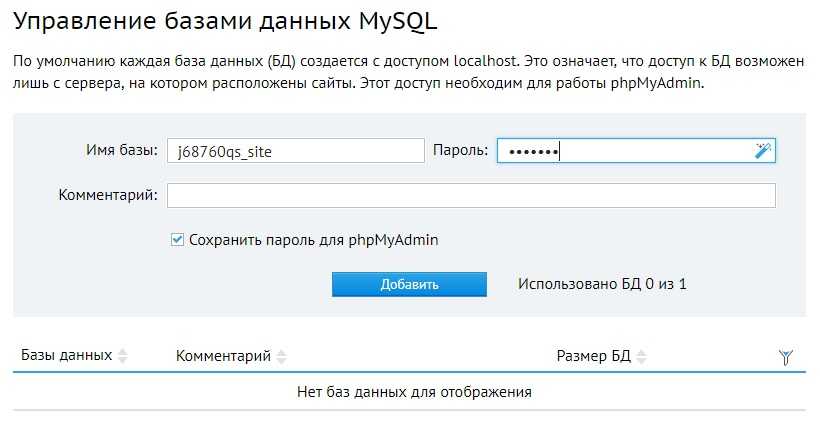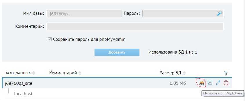 После ввода данных и нажатия на кнопку Добавить, база данных была успешно создана и готова к работе. Запишите себе имя базы данных, имя пользователя и пароль (в нашем случае имена первых двух совпадают).