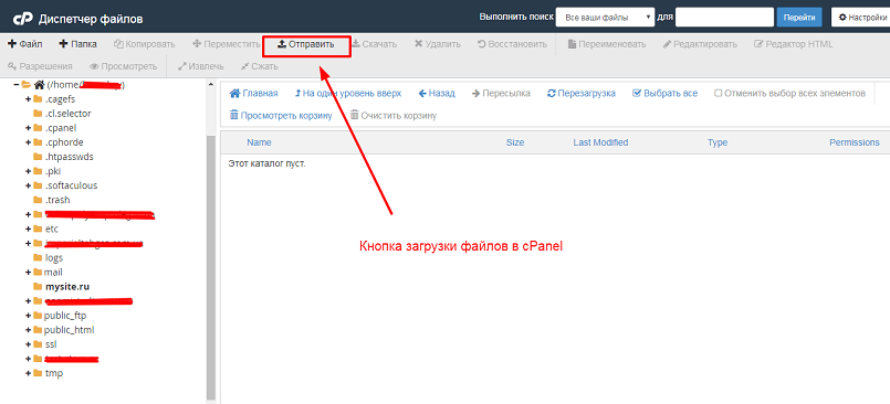 Инструмент загрузки файлов в сPannel хостинга находится в разделе Диспетчер файлов. Перед тем, как начать загрузку файлов на хостинг, папку с файлами сайта нужно заархивировать в формате zip и затем загрузить архив сайта войдя в Диспетчер файлов — папку public_html или другую директорию. Затем разархивировать его средствами сPanel (там будут кнопки Сжать и Извлечь) и перенести файлы сайта из папки mysyte.loc в корневую папку сайта, а пустую папку mysyte.loc вместе с ненужным архивом удалить.
