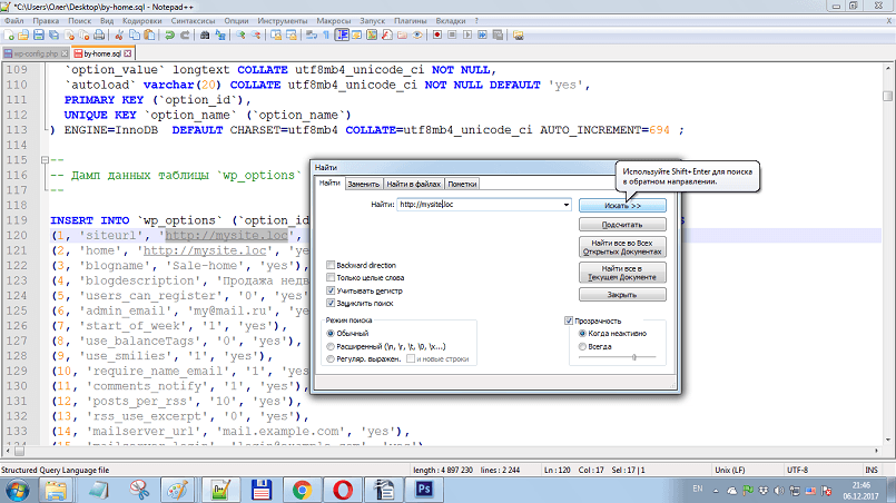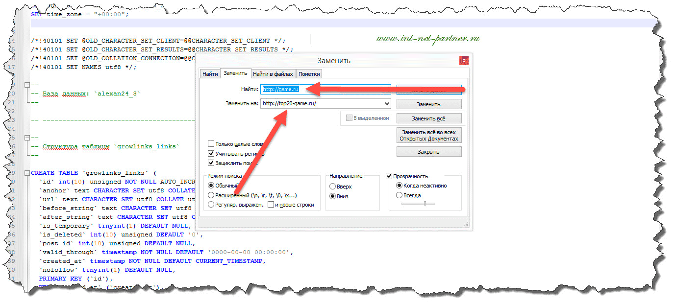 3). Теперь замените все старые URL-адреса в базе данных на новые, для этого в notepad++ нажмите ctrl+f и в всплывающем окне выберите пункт «Заменить», далее вводите в пункт «Найти» существующий URL, в пункте «Заменить на» — новый URL-адрес.
