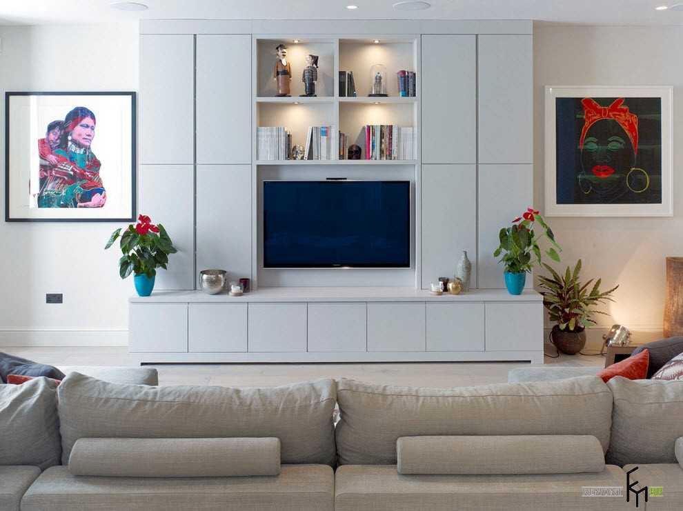 Плазменную панель можно расположить и между шкафов. Такой вариант подойдет для ценителей минимализма. Меньше полок, всяких деталей и только четкая лаконичная стена, поделенная на секции и с дверцами на механизме, избавляющем фасады от лишних ручек. Минимум контрастов и дополнительных элементов сделают гостиную идеальной.