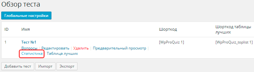 Для просмотра статистики зайдите в раздел консоли WP-Pro-Quiz. Появится список тестов, наведите курсор мышки на нужный тест, в появившемся меню выберите «Статистика».