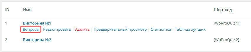 Зайдите в раздел консоли WP-Pro-Quiz. Далее наведите курсор мышки на нужный тест, под тестом появятся ссылки, нажмите на «Вопросы».