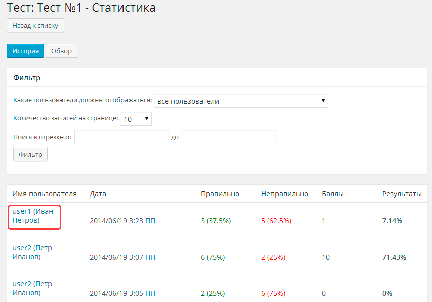 Появится табличка со списком результатов теста, в которой указан пользователь, дата прохождения теста, количество правильных и неправильных ответов, количество баллов и общий результат в процентах.