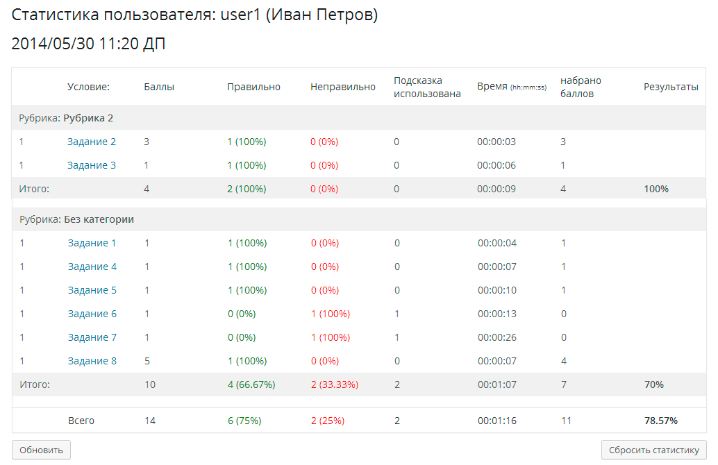Если в тесте было несколько рубрик с вопросами, то в статистике вопросы будут отсортированы по рубрикам, для каждой рубрики выводятся общая статистика.