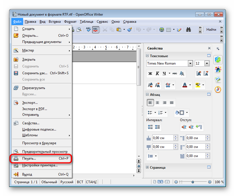 - Откройте документ для распечатки, выберите в программе меню «Файл», затем пункт «Печать».