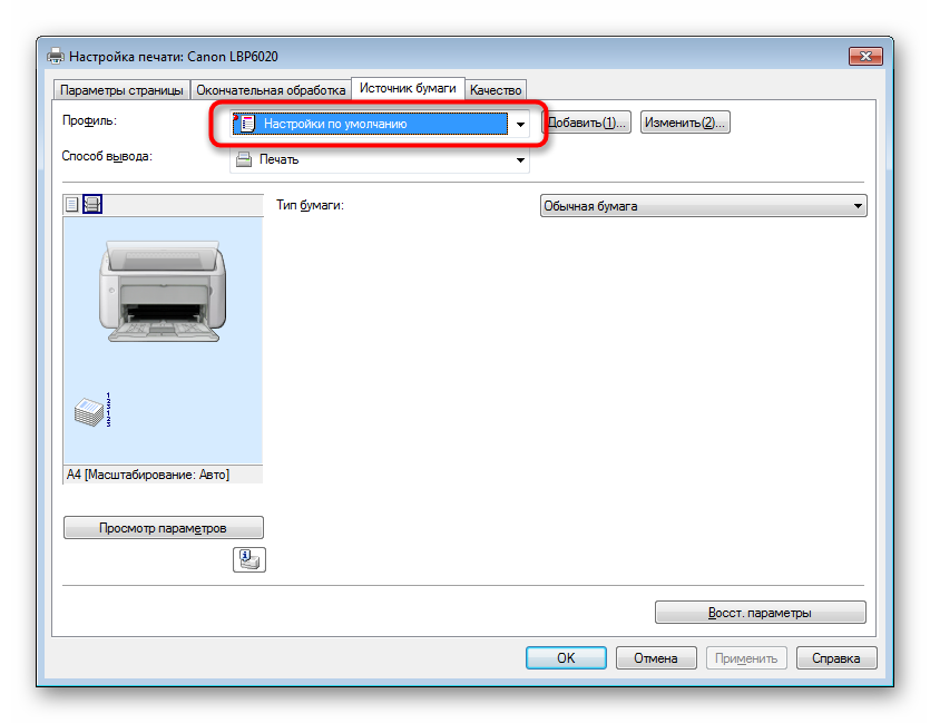 Как известно, каждое печатающее устройство настраивается в операционной системе с помощью специального установленного драйвера. Среди всех параметров присутствует и возможность настроить подачу бумаги. Случаются ситуации, когда эта настройка сбрасывается или выставляется режим ручной подачи, из-за чего и происходит проблема с обнаружением листов в лотке. Все, что потребуется от юзера — отредактировать настройки вручную, а сделать это можно так: