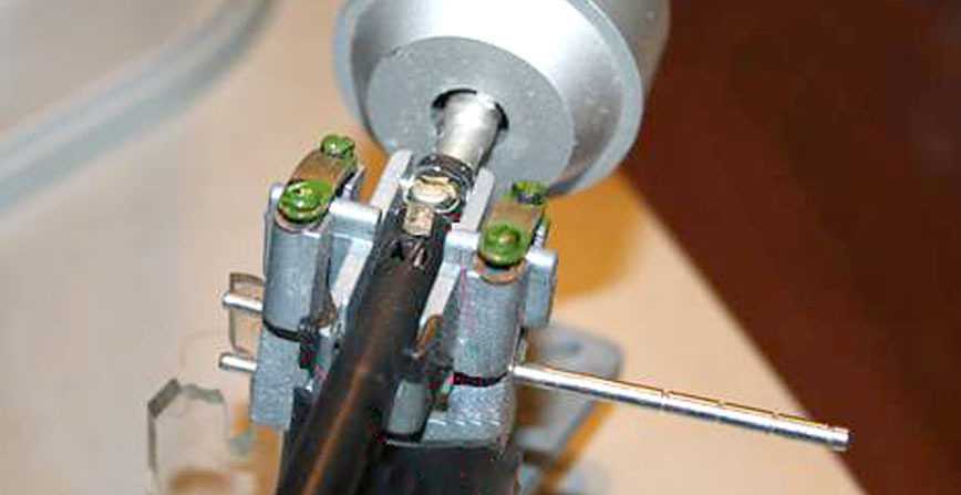 При настройке звукоснимающей головки обращают внимание на ножку тонарма, где находятся винты, удерживающие головку. Если их ослабить, то угол между зеркалом и иглой можно выставить под 90 градусов