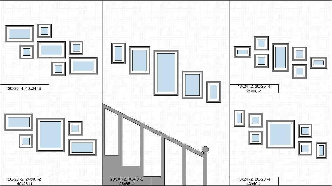 • Над лестницей. Размещение «ступеньками» – самое выгодное. Не нарушая ритма ступенек, композиция будет поддерживаться линиями косоуров и «подниматься» или «опускаться» вместе с подъемом или спуском лестницы.