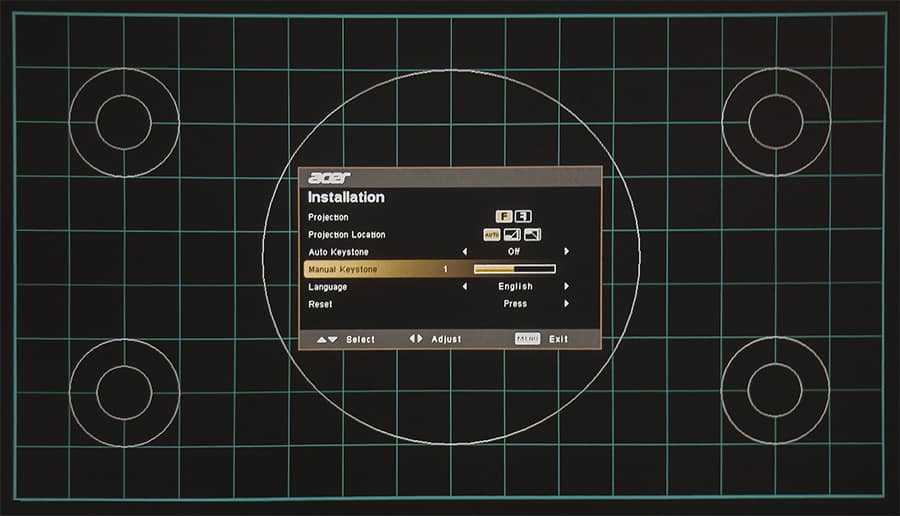 Поиграйте с коррекцией вертикального трапецеидального искажения и горизонтальной, если она у вас есть, пока проецируемое изображение не станет четким прямоугольником. Затем вы готовы перейти к следующему этапу настройки экрана.