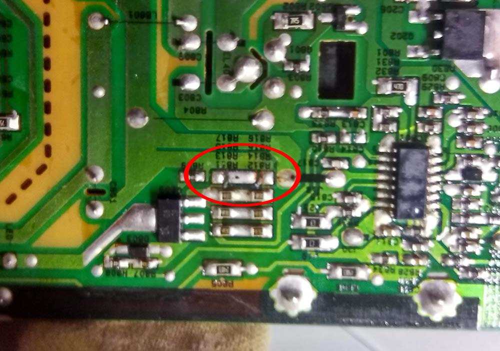 Для избежания повторных ремонтов, необходимо проверить ток, который приходит на планки. Он должен быть не больше 250mA. Посмотрев на плату, увидел что два резистора, отвечающих за ток на светодиоды были уже удалены из платы. Это очень хорошо, так как мастера, которые ремонтировали телевизор раннее сделали все как нужно.