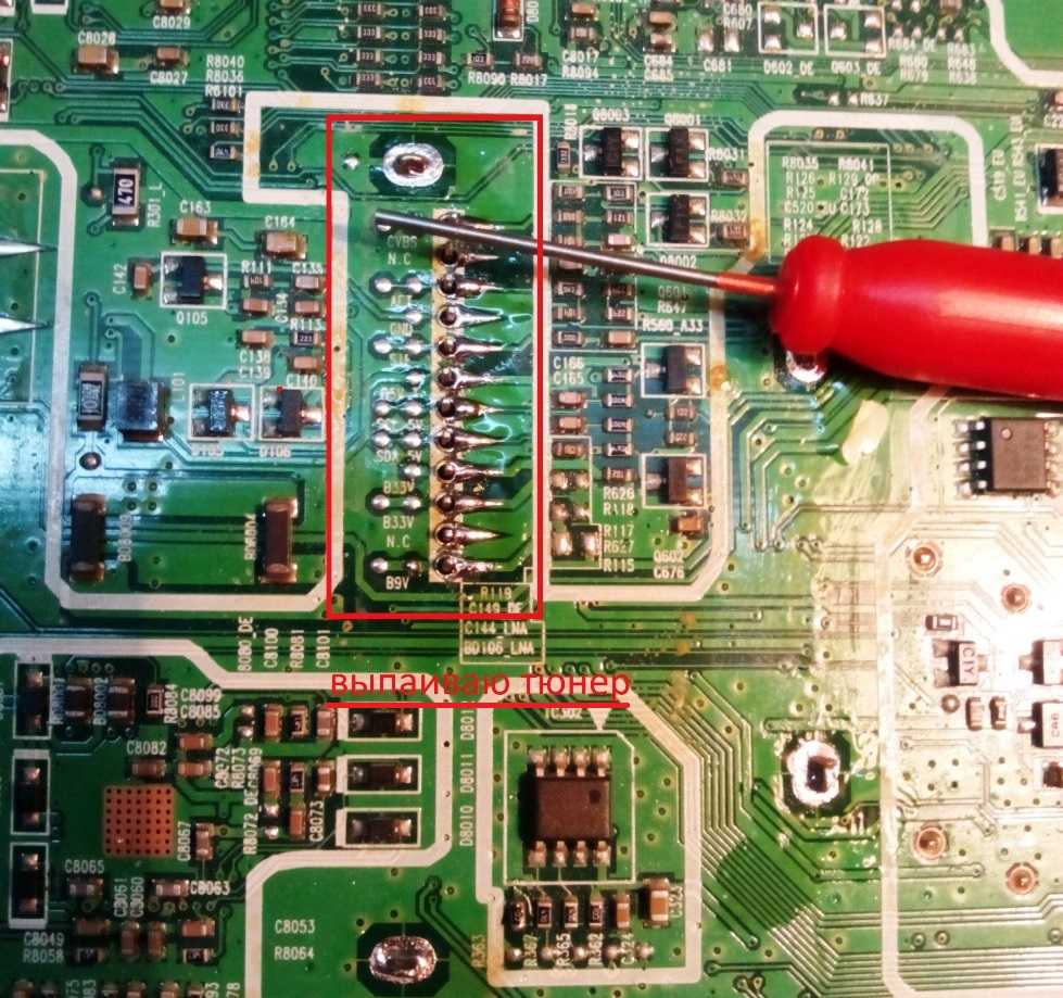 Начнем с тюнера ТВ. Чтобы провести диагностику тюнера, необходимо снять металлический экран, защищающий его от помех. Обычно он впаян в плату в трех-четырех точках. Тут пригодится мощный паяльник от 60 Вт и выше. После того, как сняли экран, можно снять тюнер. Только его придется выпаивать.